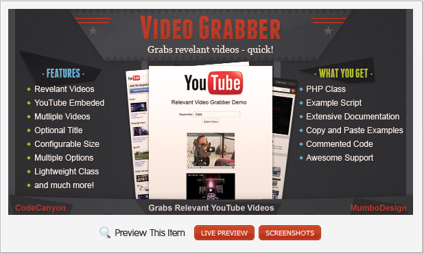 Video Grabber relevante é a classe Youtube que você vai precisar.É leve, rápido e fácil!Ele usa a API oficial do YouTube para buscar os vídeos.